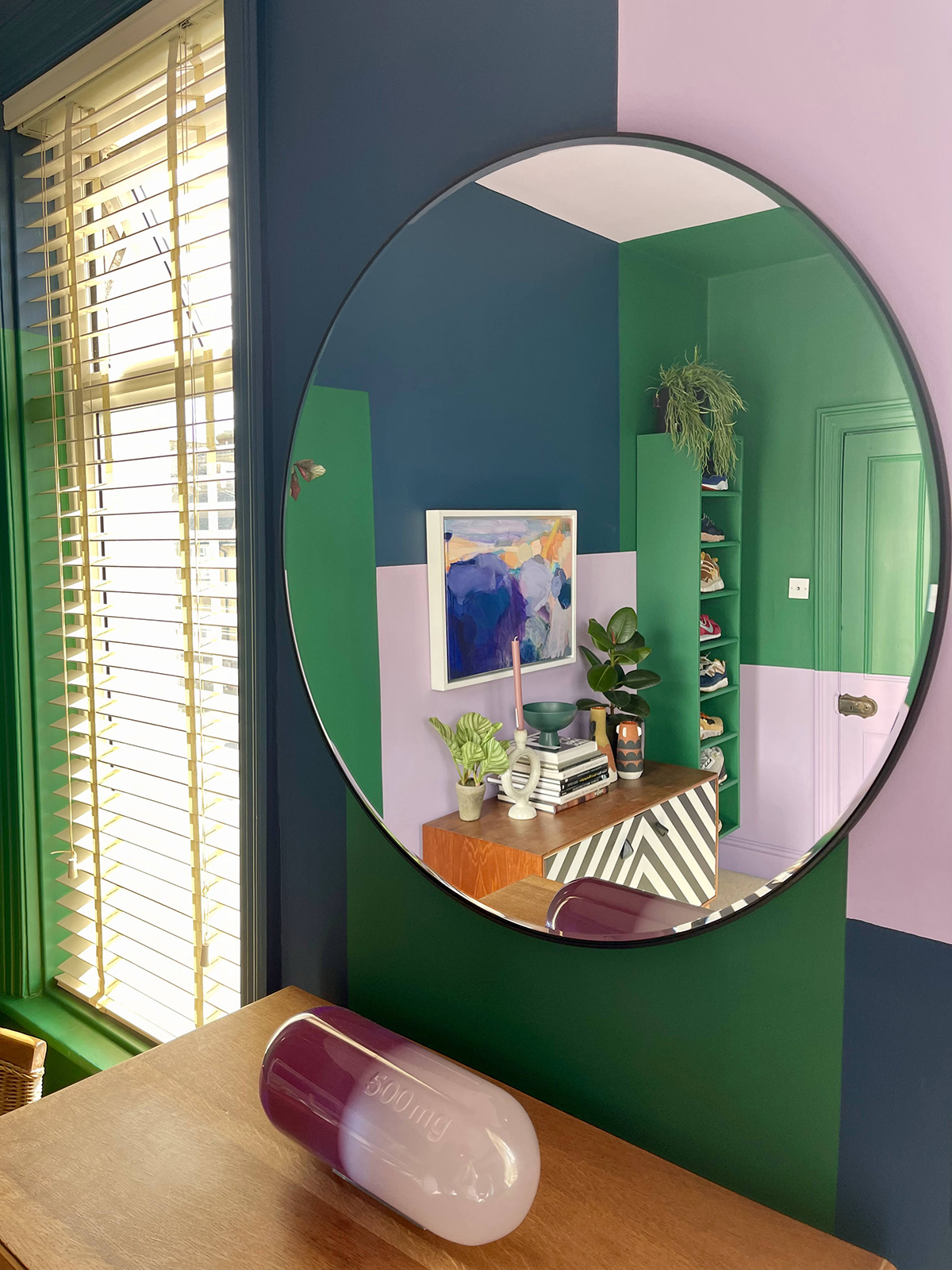 Aye had a massive declutter and clear out before the makeover which then allowed us to bring in a few well chosen accessories to dress the space. Apartment round wall mirror, Dunelm. Lucite purple and white large pill by Jonathon Adler, WA Green