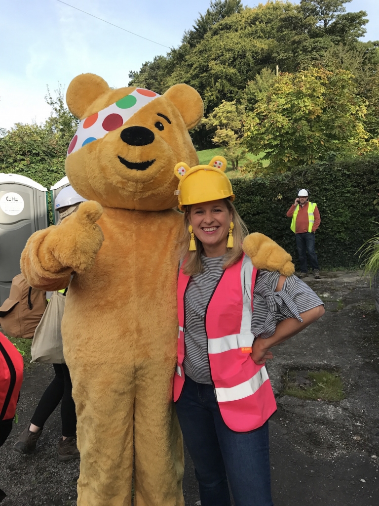 Emma lewis from The Roots Foundation with Mark Millar and Pudsey the Bear. And the delapidated scout hut.