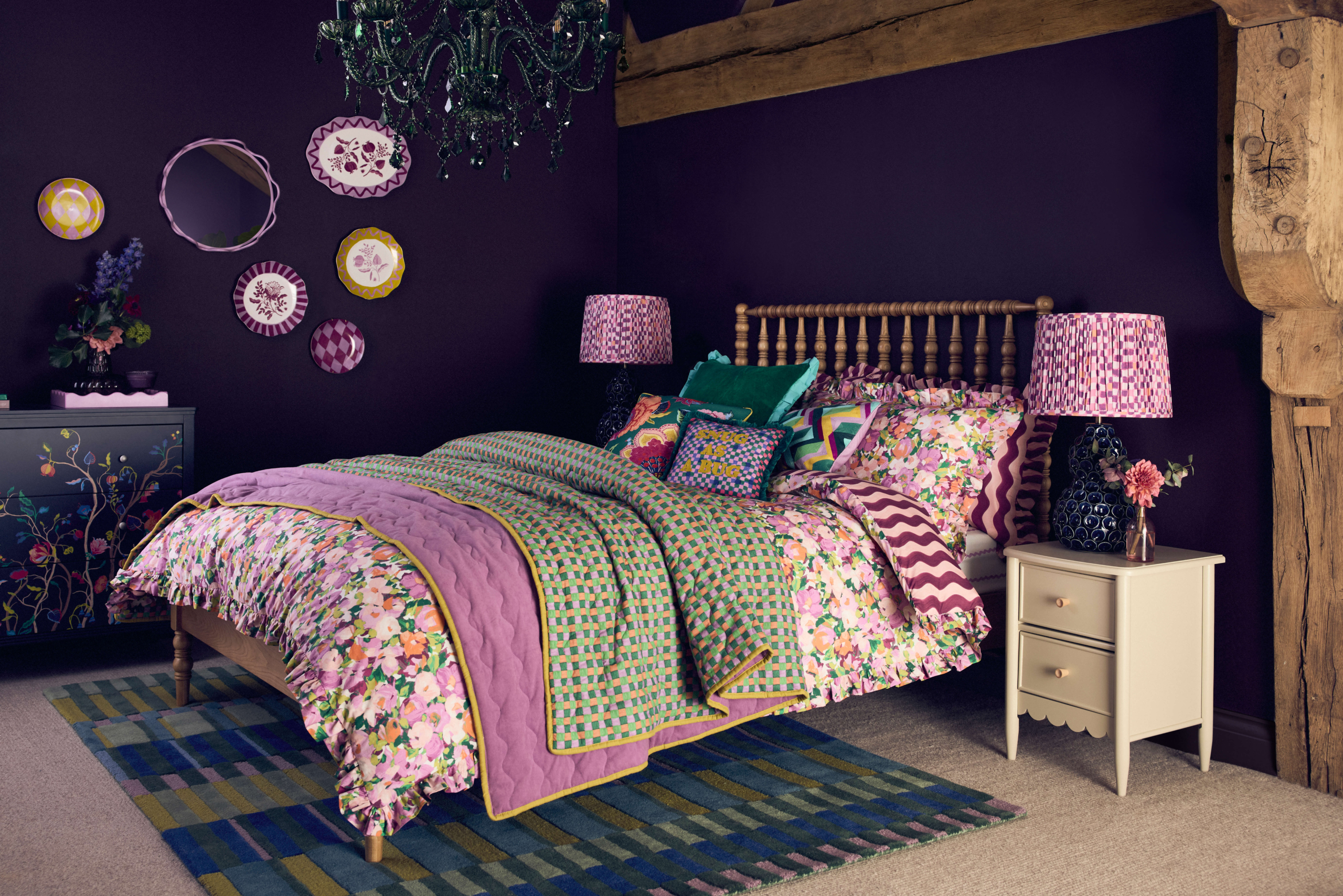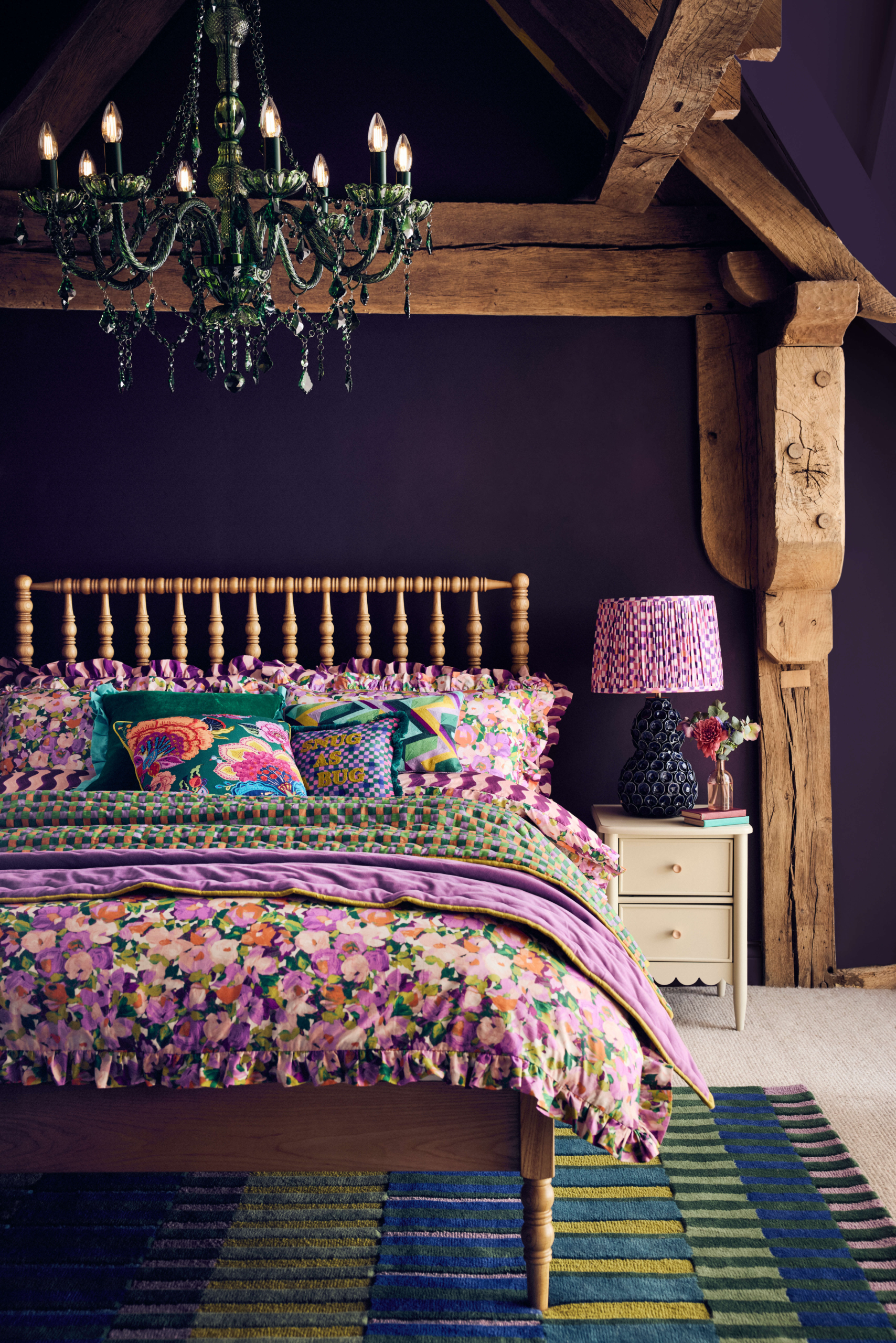 Joyful Stripe rug, from £169; Ceramic Table lamp, £85; Velvet Box Pleat cushion, £28; Enchanted Floral cushion, £28; Zig Zag cushion, £28; Bountiful Bloom duvet cover and pillowcase set, from £65; Little Geometric bedspread, £105; all Sophie Robinson x Dunelm