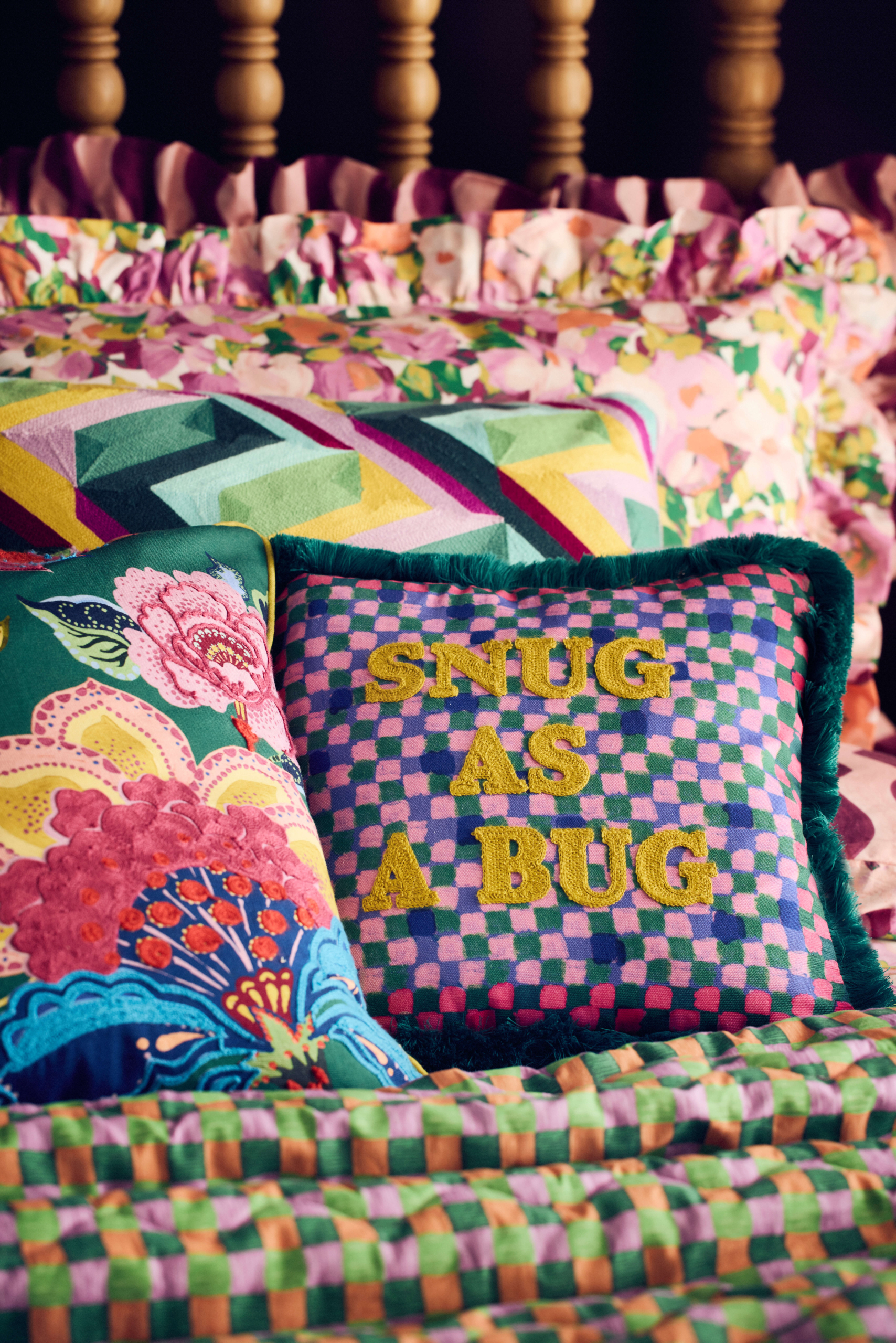 Snug As A Bug cushion, £22; Enchanted Floral cushion, £28; Zig Zag cushion, £28; Bountiful Bloom duvet cover and pillowcase set, from £65; Little Geometric bedspread, £105; all Sophie Robinson x Dunelm