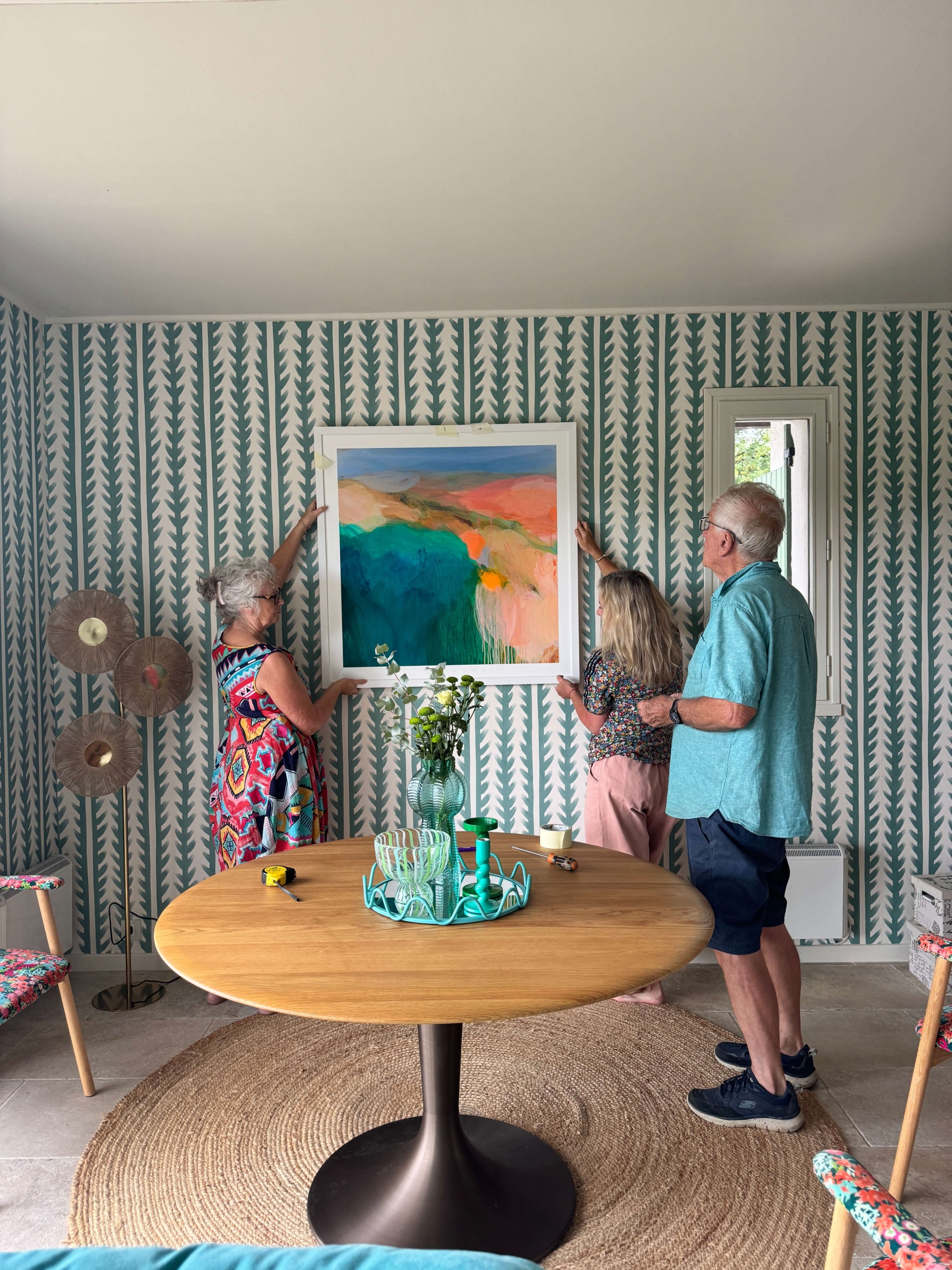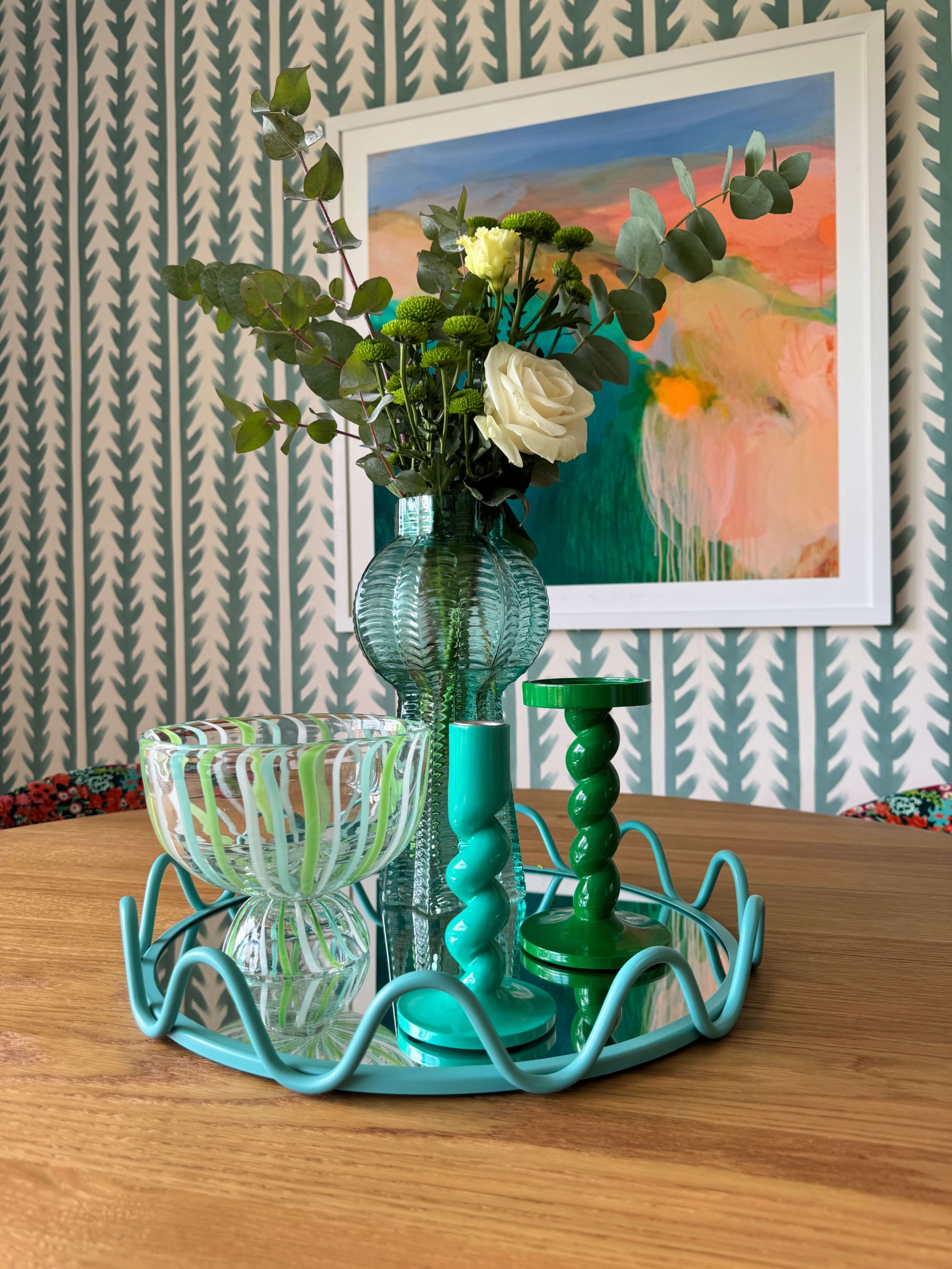 Painting by Sophie Abbott; Sticky Grass wallpaper, £70 per roll, Sophie Robinson x Harlequin; Wavy metal mirrored tray, £22, Sophie Robinson x Dunelm; Twisted candlestick holder, from £8, Sophie Robinson x Dunelm; Turquoise Abstract Glass vase, £25, Sophie Robinson x Dunelm