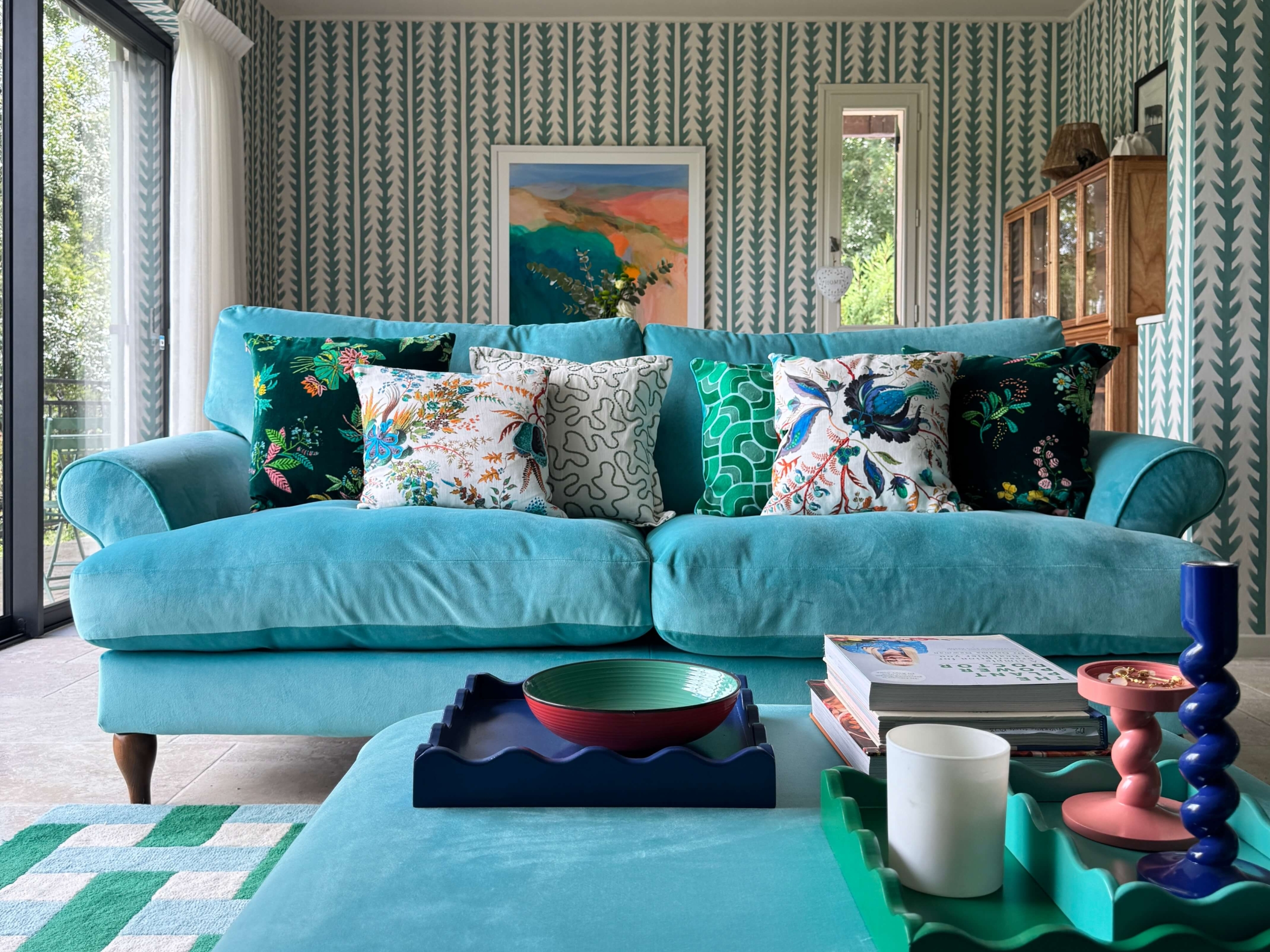 We chose plain sofas in rich green and soft aqua velvet, then layered pattern through cushions. A graphic basketweave rug helps zone the living area and adds structure underfoot. Instead of a coffee table, we used a large upholstered footstool which adds softness and more colour.