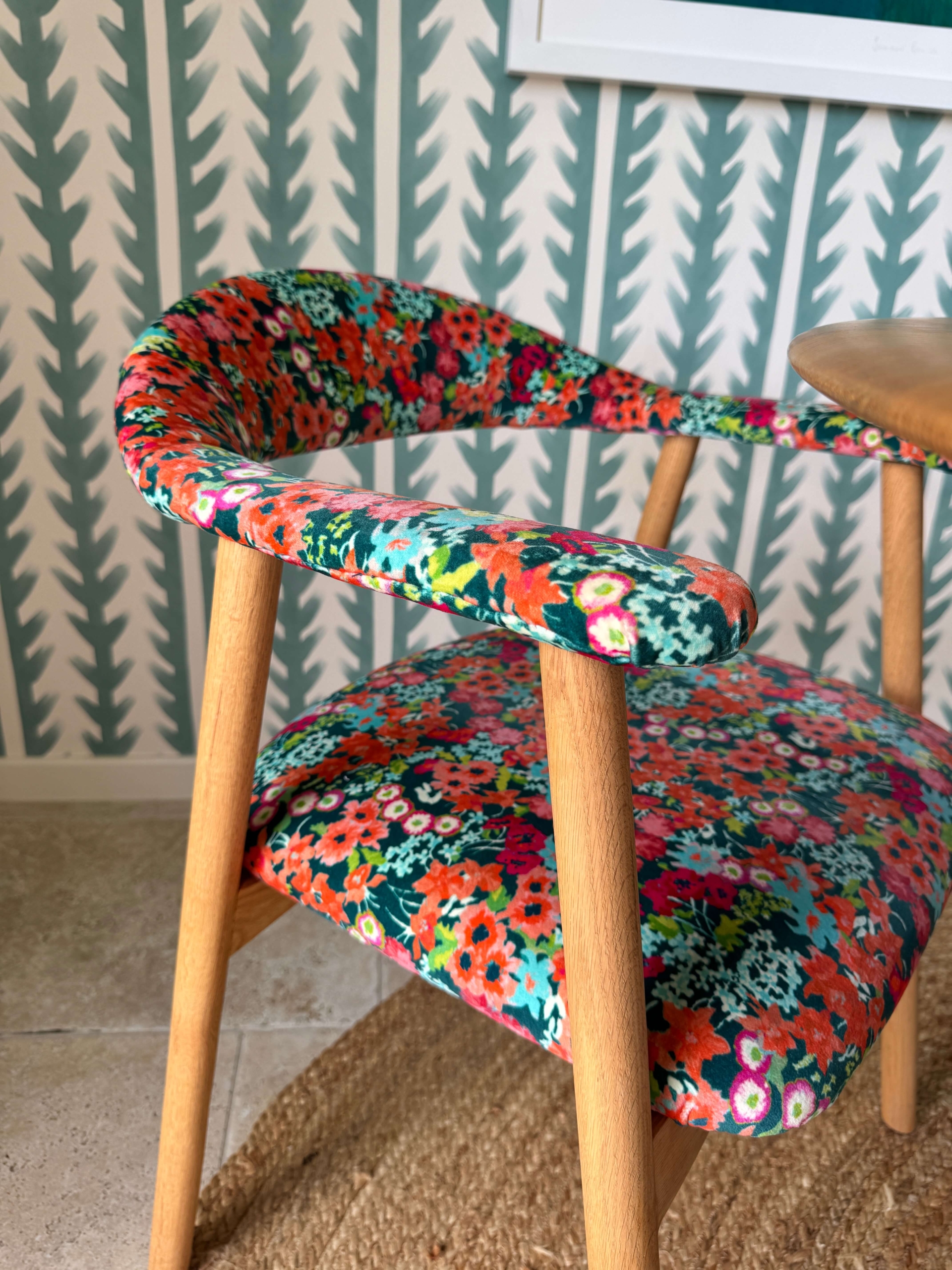We bought simple Scandi style chairs and reupholstered them in a coordinating mini floral velvet. Most shop chairs come in neutral fabrics, so reupholstering is one of the easiest ways to introduce pattern without needing much fabric.
