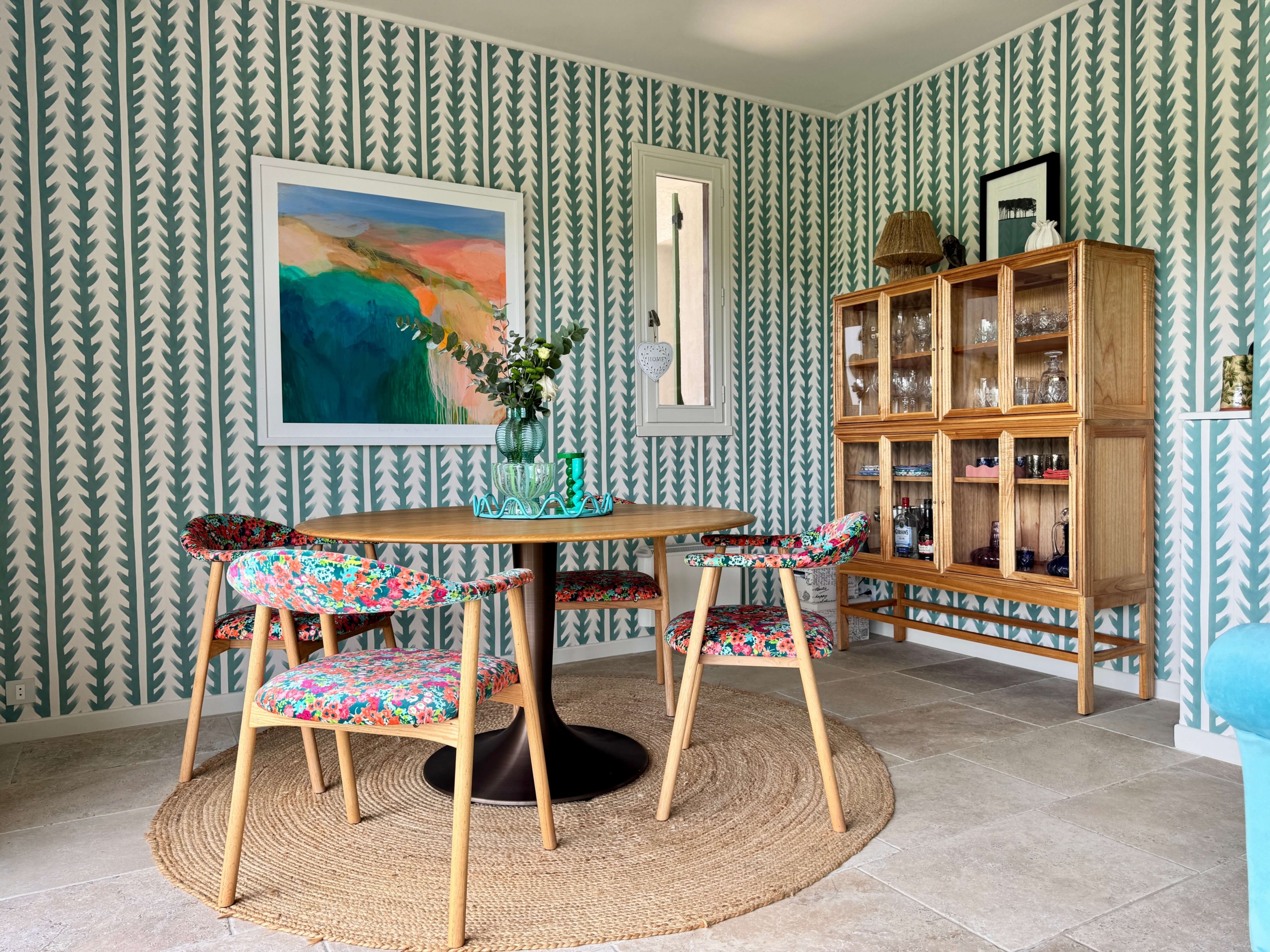 Dining chair upholstered in Wildflower Meadow fabric, £118 per metre, Sophie Robinson x Harlequin; Painting by Sophie Abbott; Sticky Grass wallpaper, £70 per roll, Sophie Robinson x Harlequin; Round jute rug, £159.99, La Redoute; Table pedestal base and table top from La Redoute, no longer available