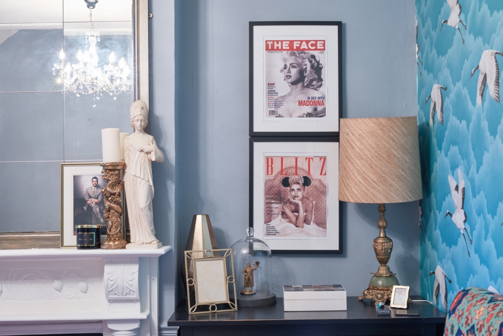 The bedroom is a room of complete delight. Having been a devout follower of the dark side movement Oliver has recently redecorated in a lighter more colourful scheme. The crane wallpaper by Harlequin really sets the drama while the Bone china blue walls from Little Greene paint keeps the over all vibe very restful. That amazing arts and crafts fire surround was just £30 off Ebay, and was dated dark wood before Oliver got his hands on it. Now its a beautiful focal point in the room and a surface to display a few of his favourite things.
