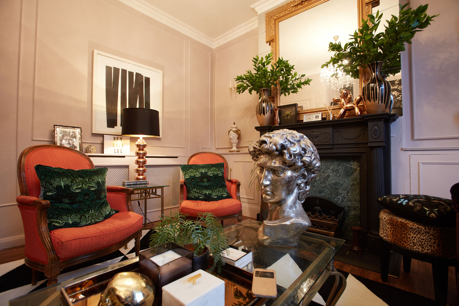 Finally the front living room is a superbly proportioned room in the Victorian property. Oliver has added to the grandeur by adding wall paneling, pinned all around and then painted throughout in a lovely warm neutral tone, China Clay dark by Little Greene Paint. The pinky hue of the walls marries up perfectly with the decadent purple velvet sofa. Pops of emerald green cushions and lush house plants keep the whole look fresh. I’m totally loving Oliver’s eclectic taste and play on scale. The enormous metallic bust perched on the coffee table is like a hearty gafaw. Then there’s the antique chairs (junk shop find) nestled next to the bold geometric rug (from Ikea) and modern artwork that helps make the whole space feel unique. And spot the cheeky bit of leopard print. I have loads of it in my wardrobe but none of it in my home so I’ve taken note! You’ll also notice that there is alot of symmetry in this room which is a clever way of making a very busy scheme balanced. A pair of lamps on a side board, a pair of armchairs, even the pair of striking vases on the mantle piece all helps to give this room a calm cohesion.The fabulous black palm print wallpaper inserted into the panels was a total bargain from Ebay. Its actually Versace but Oliver loves how the black fronds camouflages the TV. There are no less than nine cushions on that sofa which I think should be the minimum as standard! Again the colour and pattern mashing is exemplary. There’s leopard print, geometrics and palm prints all jostling together in sheer ecstasy. As a maximalist Oliver totally understands lives by the more is more mantra. And I for one can’t wait to see more from this talented and exciting designer.