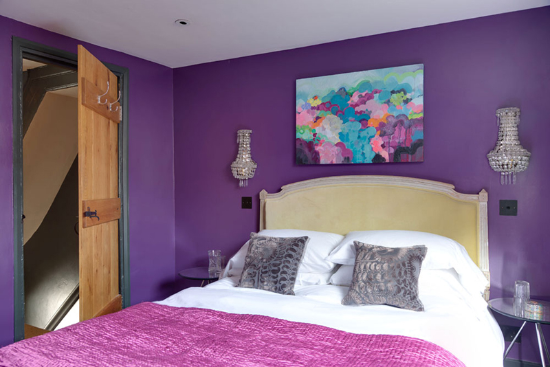 Now as always, I was on a tight budget with this bedroom design project, which called for some nifty shopping. Biggest bargain has to be the headboard. It’s actually the foot of an old French bed that we found in an antique store. As the owner hadn’t got the head, he sold it to me for £40. I bought some remnant lemon yellow velvet from a discount fabric warehouse (which has sadly closed down but eBay is great for this sort of thing) and had it covered by my trusty local upholsterer. Then cushions and the throw were high street steals, in the sale, from Habitat as were the side tables. Total heart-over-head were the French antique wall sconces from my local favourite The Three Angels. At £200 for the pair they were a total splurge but like a great pair of earrings they finish off the outfit! And a great investment as I feel they are a classic design I’ll never tire of. Just like the eyecatching painting. That’s by my best friend and colour inspiration Sophie Abbott. Check out her work (by clicking on her highlighted name) and you’ll see why I find her so inspiring.